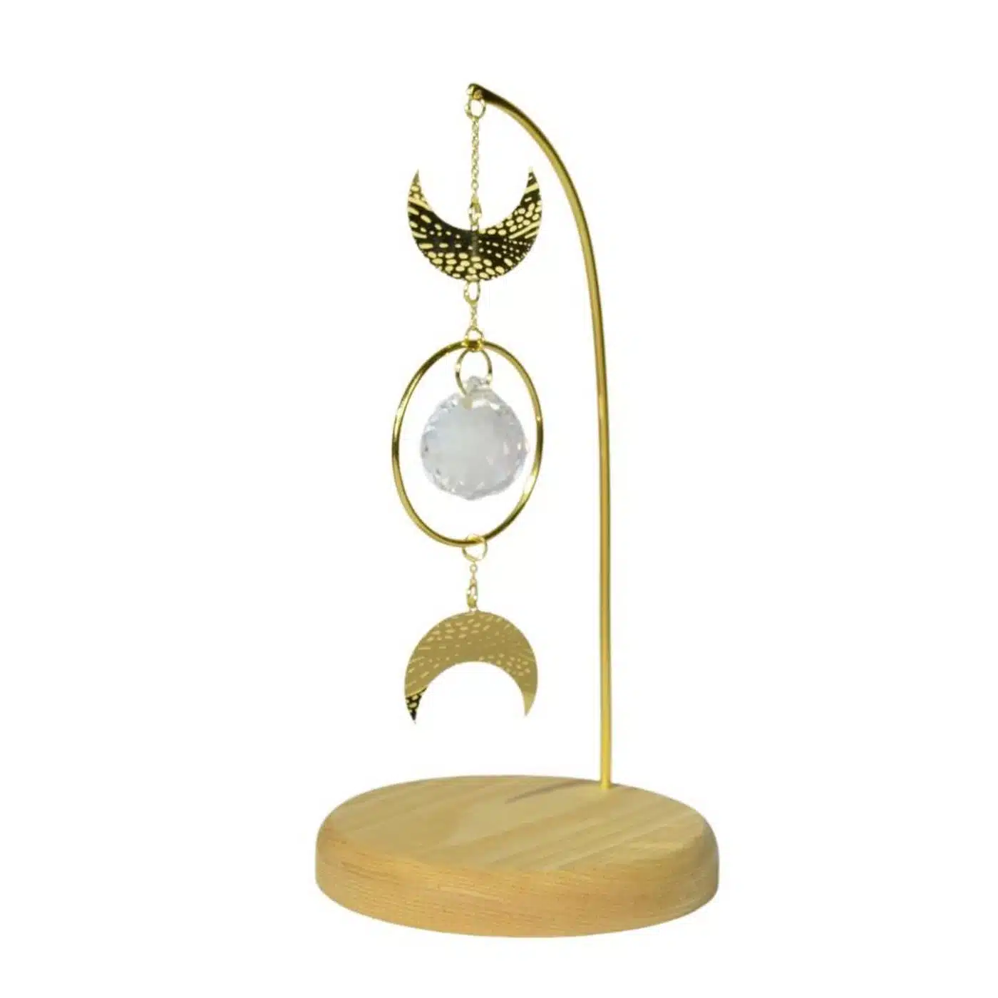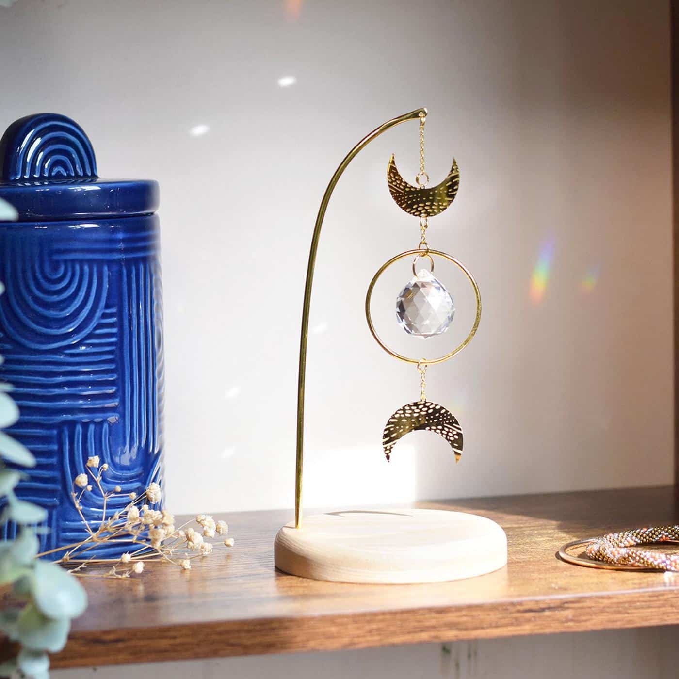 Attrape-soleil Luna en laiton, acier inoxydable et cristal de verre facetté. Socle en bois de frêne.