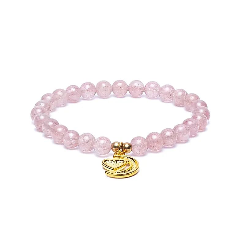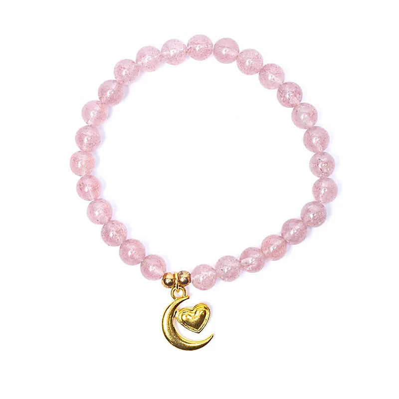 Bracelet élastique délicat en perles de quartz fraise, breloque en métal en forme de croissant de lune avec c◊ur.*