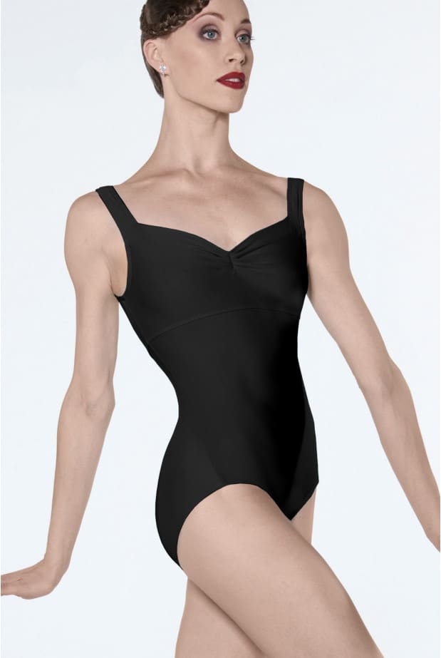 Justaucorps larges bretelles, au décolleté froncé souligné par une surpiqûre.