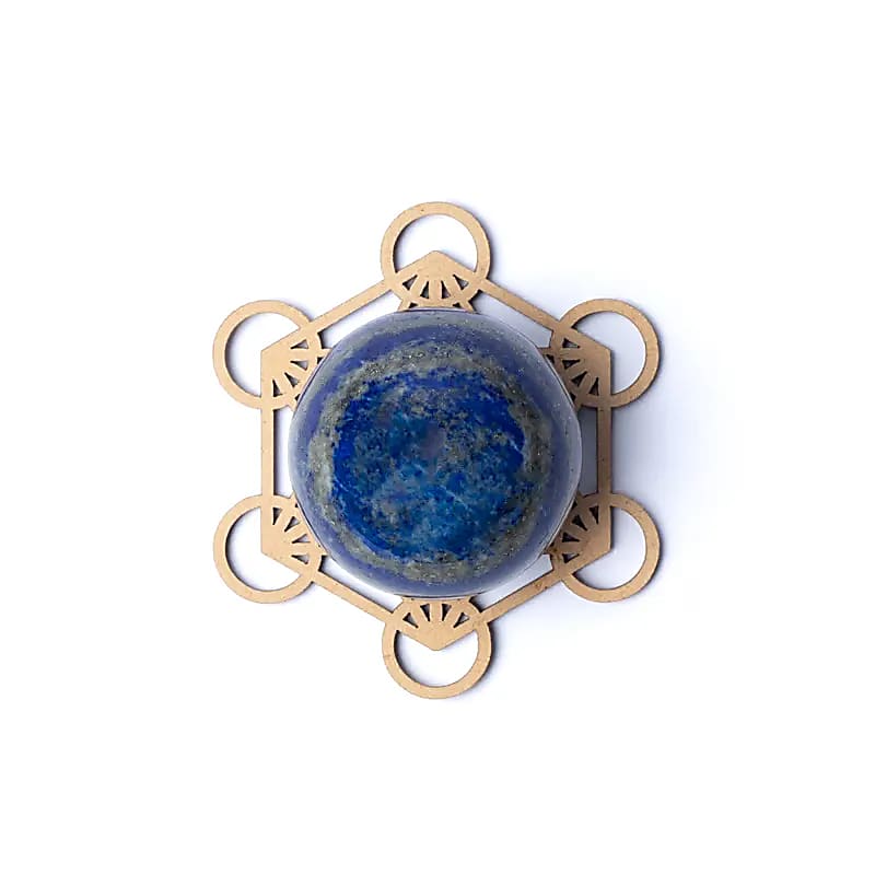 Support pour pierres précieuses découpé au laser dans un panneau en MDF (panneau composite en fibres de bois), en forme de cube de Métatron. Convient pour recharger ou servir de support à des pierres précieuses ou des sphères d’orgone.