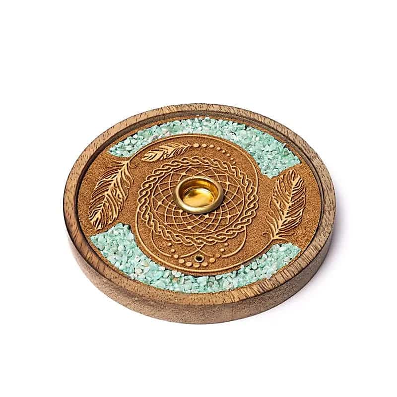 Porte-encens et cône avec décoration attrape-rêves, enrichi de pierres d’amazonite.