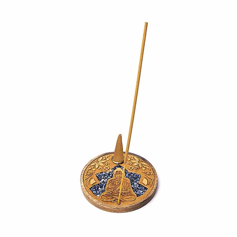 Porte-encens et cônes avec décor de Bouddha, enrichi de pierres de sodalite.